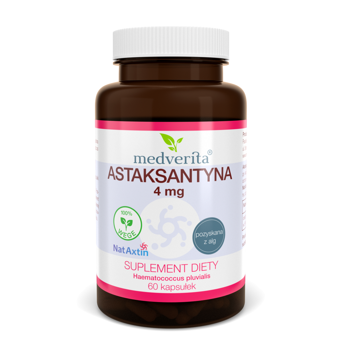 Ingredients: sunflower oil, natural astaxanthin (obtained from Haematococcus pluvialis algae), vegetable glycerin, purified water, gelatin (capsule shell).