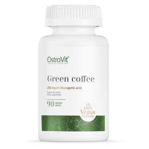 OstroVit Green Coffee is the highest quality dietary supplement in tablets containing green coffee bean extract. Each tablet contains 500 mg of pure extract, which is characterized by a high content of caffeine, thanks to which the preparation has strong stimulating and stimulating properties. Due to its high content of cholic acid, it effectively supports slimming and increases thermogenesis of the whole body. The green coffee extract is characterized by a much higher content of molecules known as chlorogenic acid compared to previously burnt coffee beans. The chlorogenic acids in the green coffee extract are easily absorbed, and in themselves or their metabolites (such as ferulic acid) have many beneficial effects on the human body. Oral intake of green coffee extract may slightly reduce body weight in overweight and obese people. The high content of this acid limits the absorption of sugars from the gastrointestinal tract. In addition, it slows down the secretion of glucose into the blood after a meal and increases the sensitivity of tissues to insulin. It is a powerful antioxidant. It has strong antibacterial, antiviral and antifungal properties.