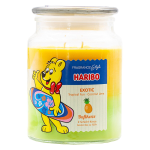 Ароматическая свеча Haribo Exotic – это уникальное сочетание двух тропических ароматов, идеально подходящее для любителей экзотического вкуса сладостей Haribo. Двухслойная свеча Haribo создана для людей, которые не могут остановиться на одном аромате. Дуэт кокоса и лайма вместе с букетом тропических фруктов напомнит вам запах любимых мармеладок Haribo. Свеча в прозрачной стеклянной банке - интересное украшение благодаря двухцветному воску, привлекающему внимание. Классический вид дополнен этикеткой с изображением мишки Харибо, которого знают и любят как дети, так и взрослые.