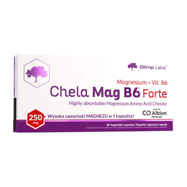Olimp Chela-Mag B6 Forte - это пищевая добавка, в состав которой входит хорошо усваиваемая формула магния в форме хелата аминокислоты Albical ™ (бисглицинат магния), обогащенного витамином B6, который взаимодействует с магнием в обменных процессах.